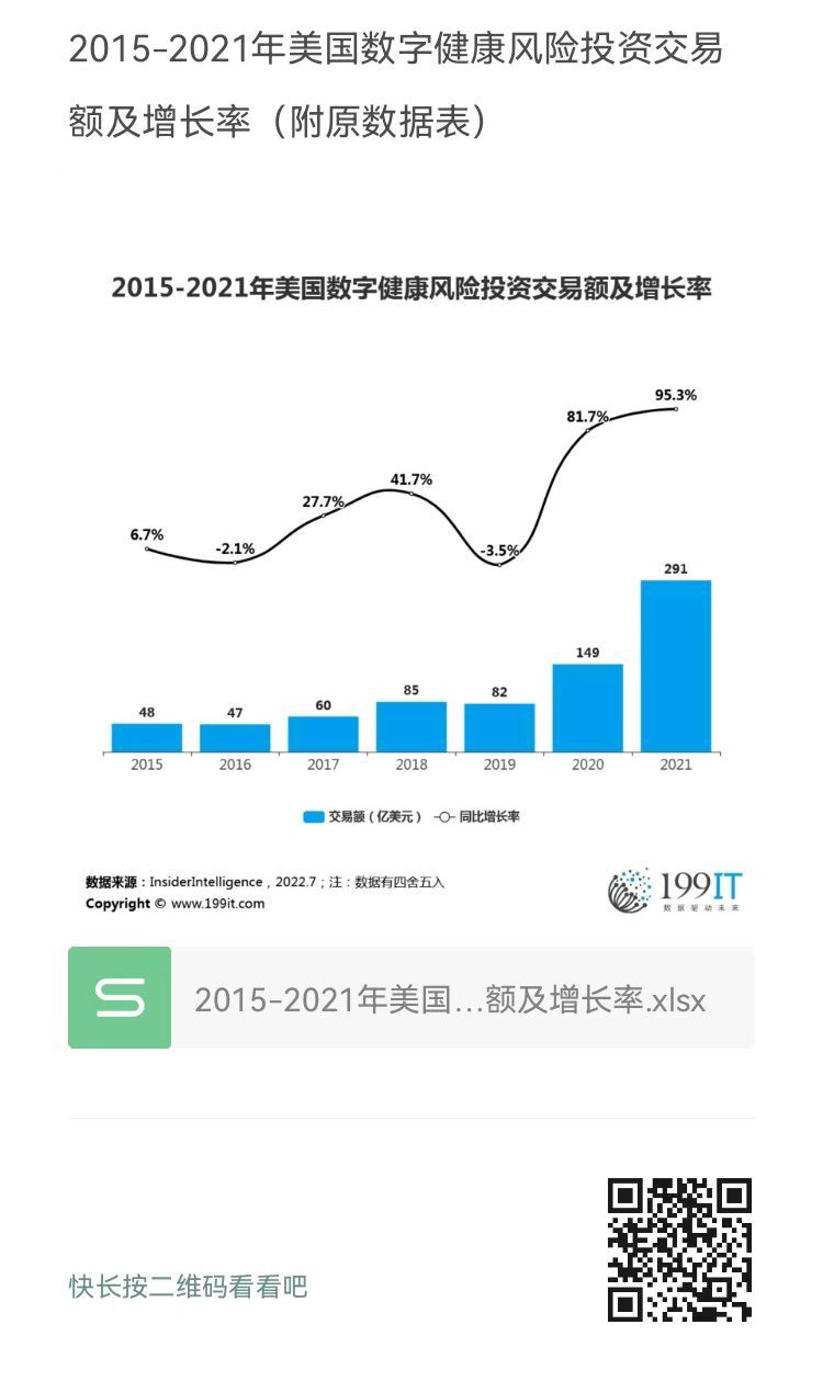 2015-2021年美国数字健康风险投资交易额及增长率(附原数据表) 更多阅读:中国信通院:2020年数字健康技术疫情防控应用案例集(附第一期下载)Startup Health:2019年Q1医疗健康初创企业洞察报告埃森哲报告:数字健康和医疗科技2012年在数字健康医疗领域投资的风险资金额高达14亿美元后社交网络时代的投资方向:数字健康产品数字健康:为每个人释放价值报告日本医疗团队:长期低头玩手机致颈椎变形病例2020年3月-2021年3月伦敦希思罗机场乘客人数同比增长率(附原数据表) 2022年Q1美国主要智能手机厂商出货量市场份额(附原数据表) 2022年Q1全球主要PC厂商出货量及增长率(附原数据表) 2022年亚太主要AI使用案例支出市场份额(附原数据表) 2020年全球各地区5G普及率(附原数据表) 2021年Q1欧洲主要可穿戴设备厂商出货量及增长率(附原数据表) 2020年Q3全球Chromebook电脑出货量市场份额(附原数据表) 收入最高的YouTubers的内容类别TOP10(附原数据表)