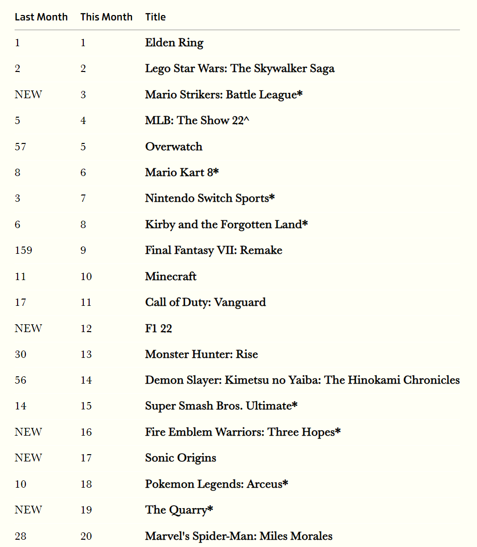 排行榜中还有几个新标题,包括《马里奥前锋:对战联盟》排名第3、《F1 2022》排名第12和《采石场》排名第19。