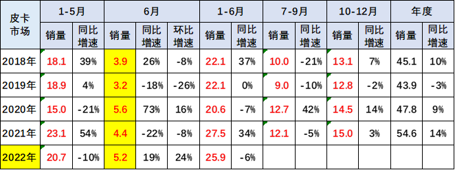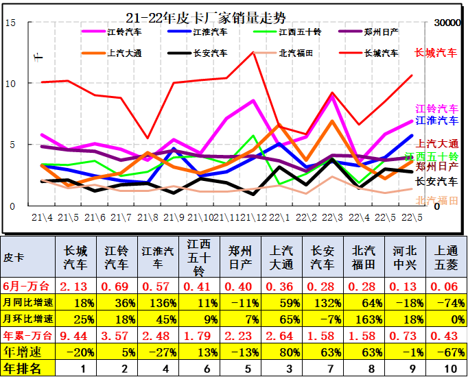 今年 1-6 月的总体皮卡走势相对较大,达到 25.9 万辆,较 2021 年 1-6 月下降 6%,产销表现还是很好的。