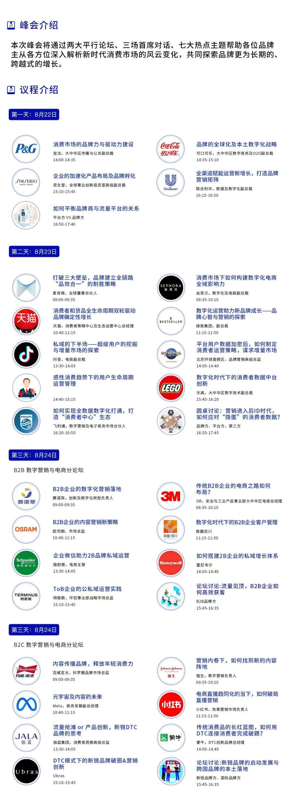 DMES 2022峰会共三天,首日为全体大会及首席对话环节,后续两天中,我们共设置了七大热点主题板块,同时在大会第三天将分为B2C数字营销及电商与B2B数字营销及电商两大分论坛共同进行。