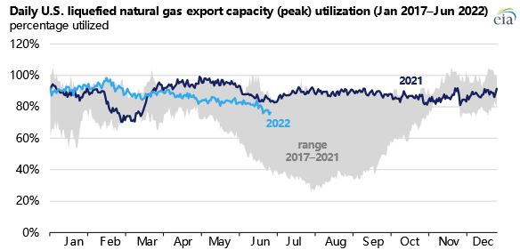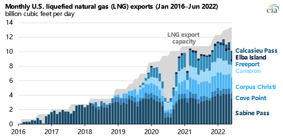 自2021年11月以来,已安装的美国液化天然气出口能力增加了约19亿立方英尺/日。EIA估计,截至7月,美国的天然气液化能力平均为11.4亿立方英尺/日,短期峰值为13.9亿立方英尺/日。