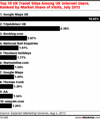 Experian Marketing Services 2013年6月的一个调查显示,Google Maps UK 吸引了超过10%的用户,使其成为最受英国客户喜爱的旅游网站;紧随其后的是TripAdvisor UK,拥有6.38%的用户;Booking.com, National Rail Enquiries 和Thomson Holidays分列三至五位
