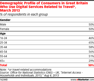 根据Office for National Statistics (ONS) — UK2013年3月的调查,英国半数以上的16岁以上用户使用数字渠道研究旅游事宜。根据ONS的调查,在过去的五年中,这一人群比例在44%到52%之间波动,表明市场相对成熟。