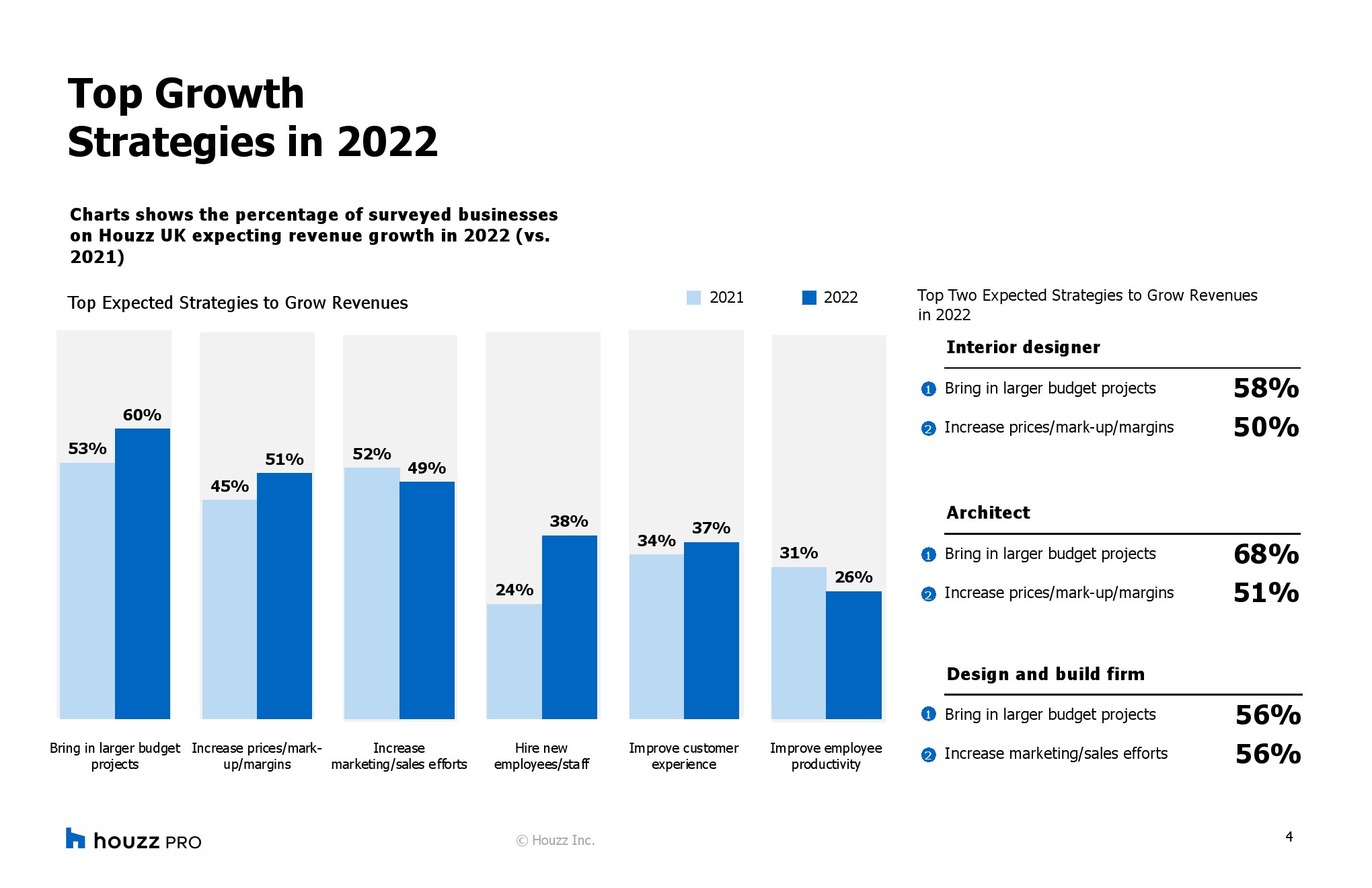 设计和建筑公司员工对2022年的收入增长最为乐观(88%),其次是室内设计师和建筑师,增长率分别为80%和76%。所有行业的公司都计划通过引入更大的预算项目来增加收入(60%)。
