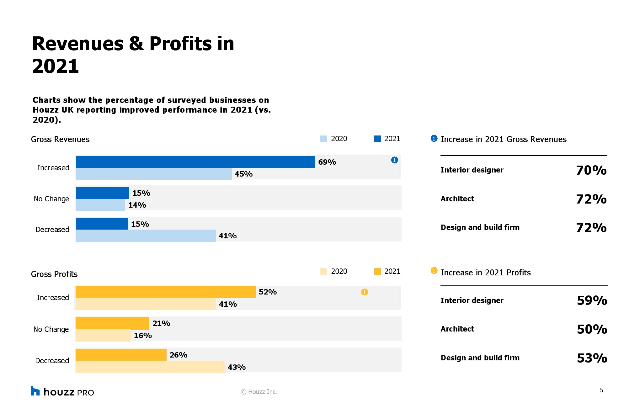 2021年,报告收入同比增长的企业比例高于过去四年(69%)。2/3的公司报告称,今年的收入增长达到或高于他们最初的预期(69%)。近3/4的设计和建造公司和建筑师报告称,2021年的总收入增长(72%),其次是室内设计师行业(70%)。