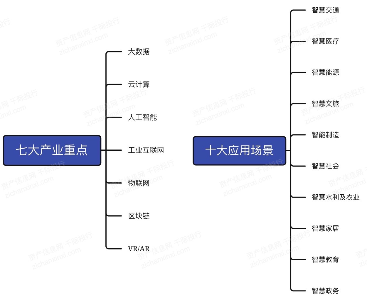 《中华人民共和国国民经济和社会发展第十四个五年规划和 2035 年远景目标纲要》指出,数字经济重点产业为大数据、云计算、人工智能、工业互联网、物联网、区块链、虚拟现实增强系统; 重点十大应用场景为:智慧交通、智慧能源、智能制造、智慧农业及水利、智慧教育、智慧医疗、智慧文旅、智慧社会、智慧家居和智慧政务。