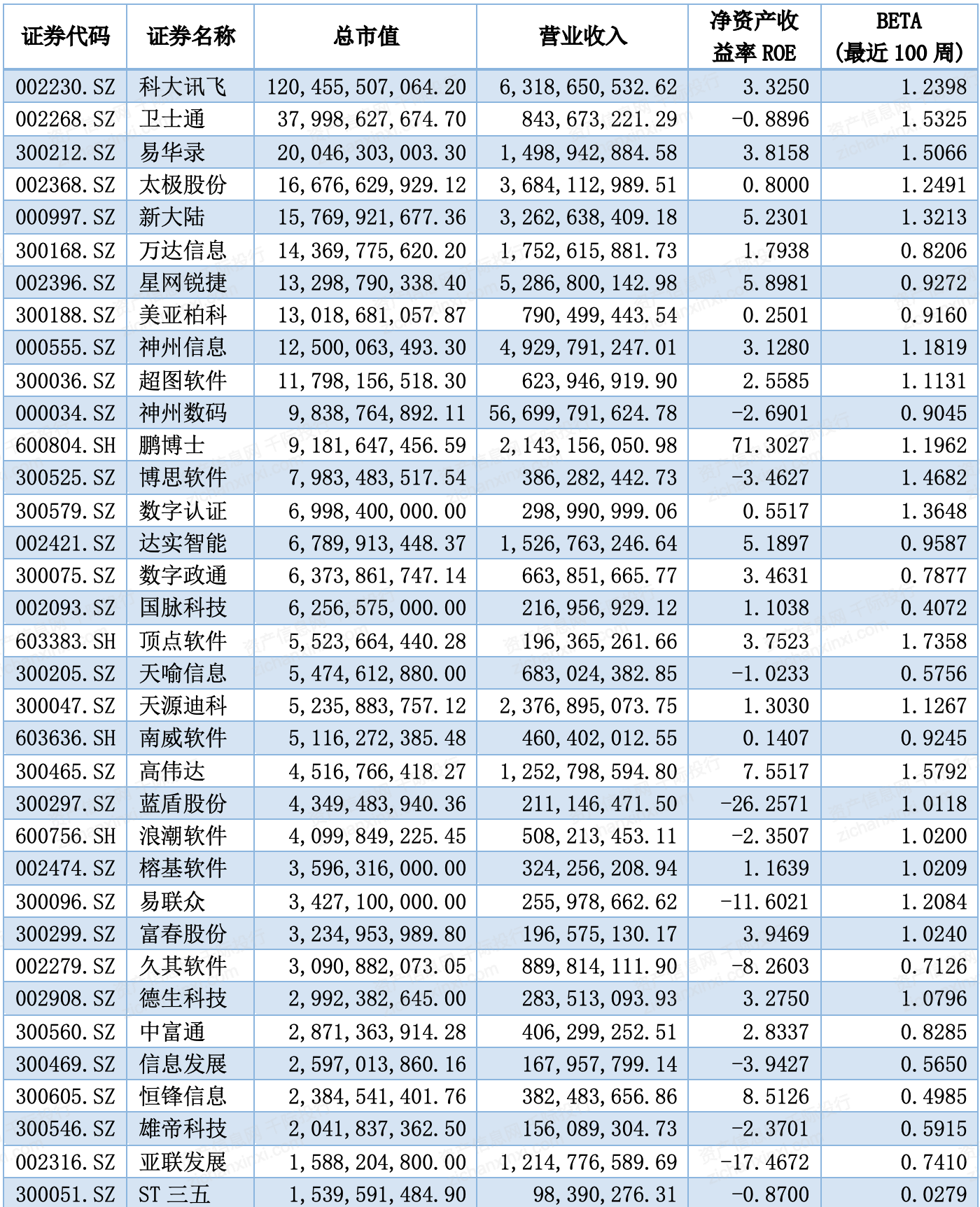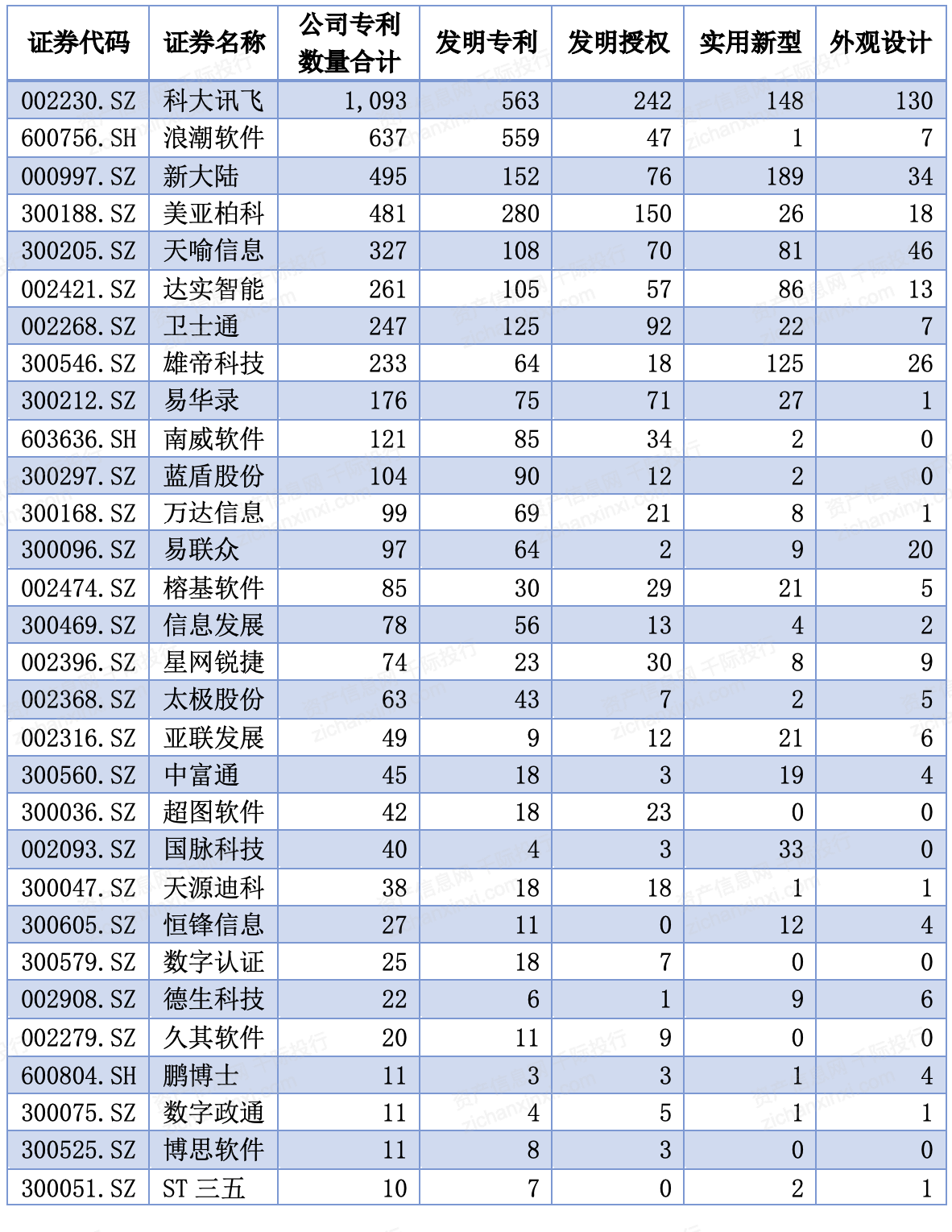 iFinD 数据显示,数字中国板块中共有 35 家上市公司。其中,专利授权数量前 3 名的公司分别是科大讯飞、浪潮软件、新大陆,所对应的专利授权数量分别为 1093 件、637 件、495 件。