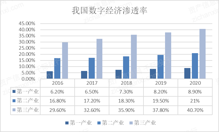 2020 年,我国服务业、工业、农业数字经济占行业增加值比重分别为 40.7%、21.0%和 8.9%,产业数字化转型提速,融合发展向深层次演进。中国信通院白皮书指出,随着数字经济的发展,产业链数字化趋势明显,数字技术在产业链改造与重构中发挥的作用愈加深刻。以物联网、人工智能、云计算、大数据、5G、区块链等为代表的新一代数字技术迅猛发展,传统产业数字化转型成为创新发展的主要驱动力、实现高质量发展的内燃机。随着全球范围内数字技术创新发展与深度融合,数字技术已逐渐成为产业链 “标准化” 流通媒介,全球价值链中传统产业的简单劳动环节。