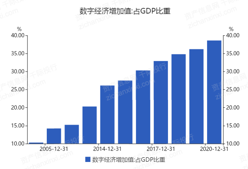 近年来,我国数字经济发展迅速。我国数字经济的总体规模已从 2005 年的 2.62 万亿元增长至 2020 年的 39.2 万亿元; 数字经济总体规模占 GDP 的比重也从 2005 年的 14.2% 提升至 2020 年 38.6%。数字经济在国民经济中的地位愈发突出,贡献水平显著提升。
