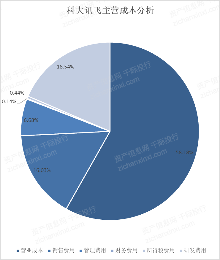 以科大讯飞的主营成本分析为例,可以看出科大讯飞成本中占比最高的是主营成本,高达 58.18%。其次占比较高的是研发费用,占比约 18.54%。销售费用占比约 16.03%。