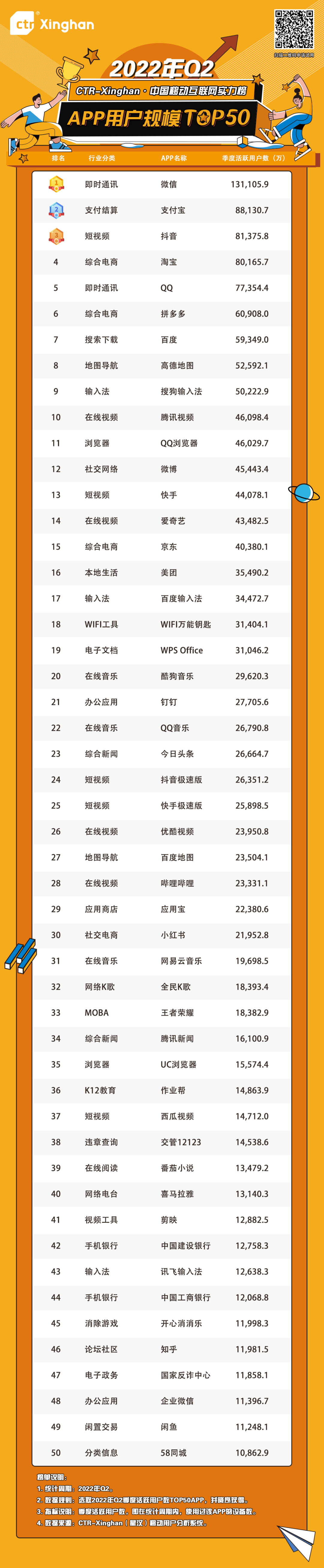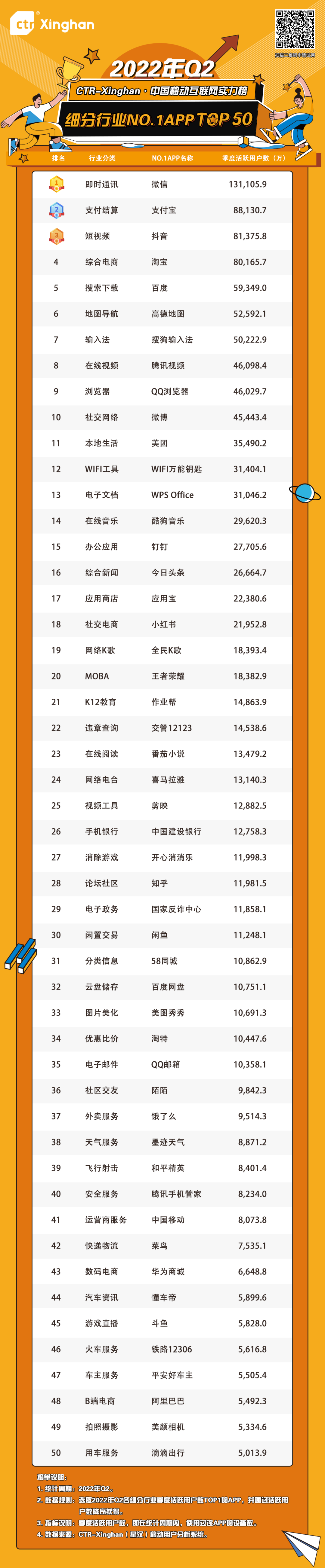 本次发布的《CTR-Xinghan • 2022Q2中国移动互联网实力榜》由“APP用户规模TOP50玩家榜”和“细分行业NO.1 APP TOP50玩家榜”两大榜单组成。