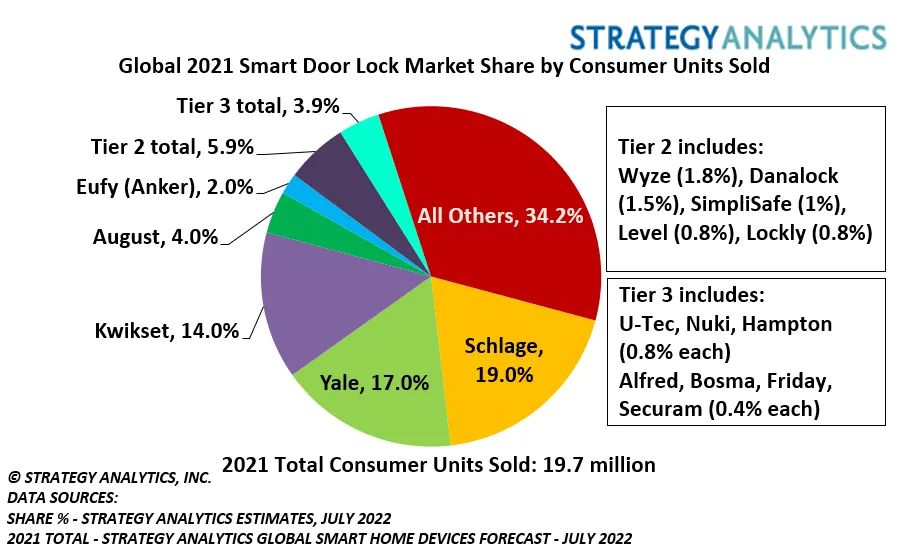 Strategy Analytics近期发布的研究报告《2022年智能锁市场:产品、玩家和预测》指出,全球智能锁市场的主要参与者——Yale、Kwikset和Schlage几乎已经巩固了他们在全球消费智能锁市场上的领先地位,尽管ASSA ABLOY的品牌正准备从这一群体中分离出来。ASSA ABLOY即将收购Spectrum Brands的硬件和家装部门,其中包括Kwikset锁品牌,这将使这个已经庞大的锁业集团变得更大,并在全球消费智能锁市场上更具影响力。Strategy Analytics预测,到2027年,消费者支出将达到46亿美元,智能锁销量将达到4400万。Strategy Analytics估计,在2021年,ASSA ABLOY占据了全球智能锁市场21%的份额,成功收购Kwikset将使ASSA ABLOY的市场份额扩大到35%,几乎是Allegion的Schlage的两倍。