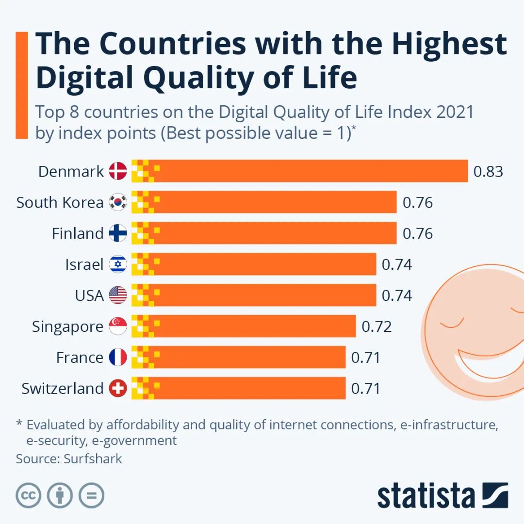 全球各国数字化生活水平大排名!猜猜第一名是谁? 根据VPN提供商Surfshark的数据,丹麦拥有世界上最好的数字生活质量。2021年,该国在该公司的数字生活质量指数中达到0.83点,在该公司比较的110个国家中排名第一。 韩国和芬兰以0.76分并列第二。新加坡排在第4位,前8名包括两个北欧国家和两个亚洲国家以及美国、以色列、法国和瑞士。 在排名中,新加坡在宽带速度方面排名第一,而丹麦在互联网负担能力和电子基础设施方面排名最高。韩国在互联网质量方面排名第一。剩下的两个标准,电子政府和电子安全,分别被美国和希腊赢得。 来自:Statista 更多阅读:Nature:携带相同基因组的癌细胞或许会表现出不同的行为!途虎养车:2018中国汽车用户线上养护行为报告自如研究院:2021年10城毕业生租房报告国际顶刊《PNAS》:爱发朋友圈的人,更容易长寿在中国,只抓一个权健是不够的世界各城市60平米房屋成本2025年世界城市化前景:成果摘要OIV:2024年全球葡萄与葡萄酒产业现状J.D. Power:Citi以802分领跑2025美国抵押贷款满意度榜单,传统银行重塑服务优势中国睡眠健康研究白皮书:2025年成年人平均睡眠6.85小时ACSI:美国客户满意度指数2025年Q3稳定76.9,各行业用户体验现成交趋势同理心经济学:为什么人际互动是未来商业的核心?联合国:2025年全球减灾风险评估报告FAO:2025年10月全球食品价格指数进一步回落FAO:2025年世界粮食与农业状况