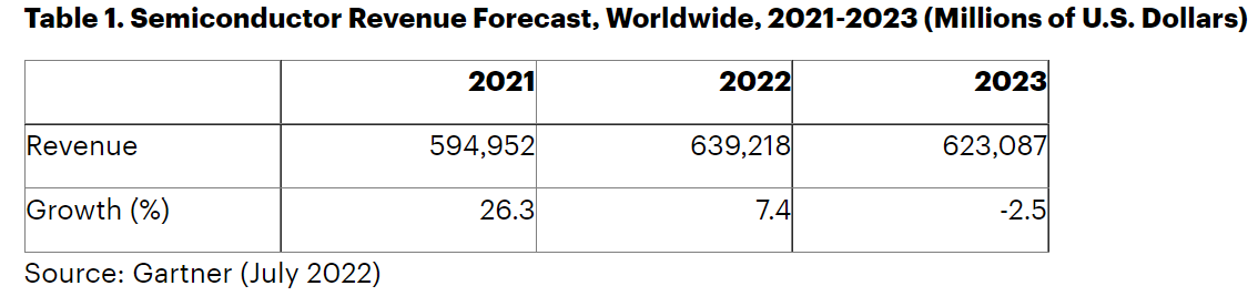 根据Gartner的最新预测,预计2022年全球半导体收入将增长7.4%,低于2021年的26.3%。低于上一季度预测的增长率(13.6%)。