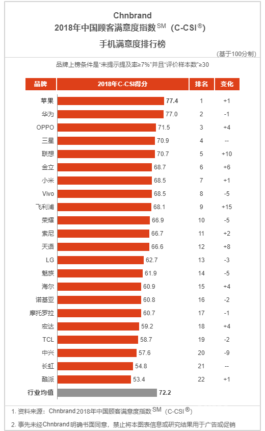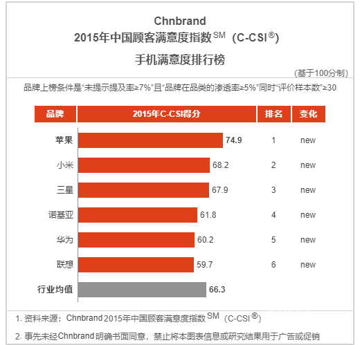 2015年,Chnbrand手机满意度排名前6的手机品牌分别是:苹果、小米、三星、诺基亚、华为和联想。当时,苹果的客户忠诚度、总体满意度、要素满意度分别得分84.8分、74.7分及70.0分;小米三个方面分别得分77.2分、70.2分、61.6分;华为当时的得分依次为68.4分、62.2分及54.2分,均未达到行业均值。
