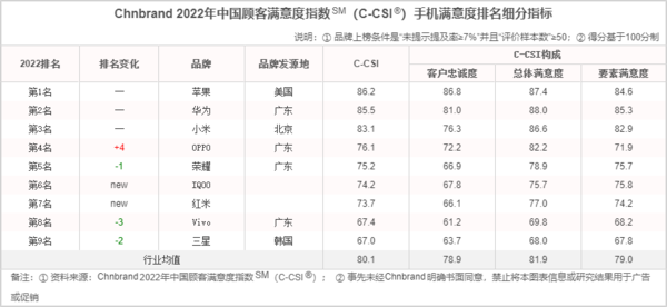 苹果、华为、小米是顾客最满意的三个品牌,2022年C-CSI得分分别为86.2分、85.5分以及83.1分,排名和2021年相比没变化,口碑相对比较稳定。