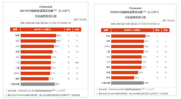2021 & 2020年手机满意度排行榜