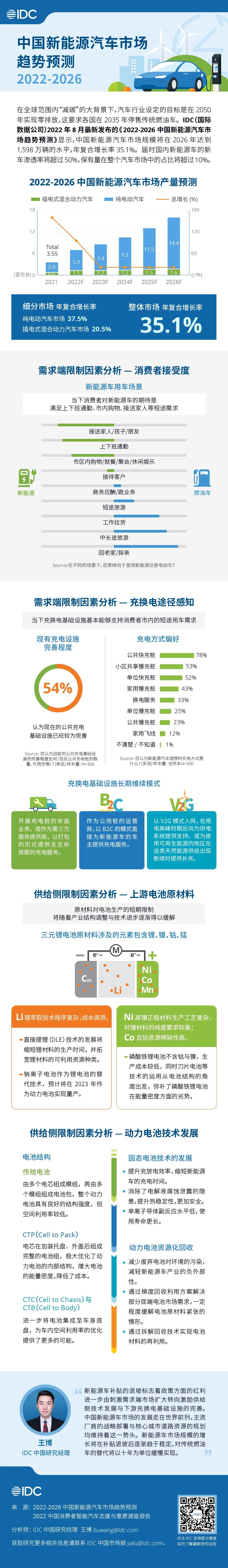 IDC:2022-2026中国新能源汽车市场趋势预测 在全球范围内“减碳”的大背景下,汽车行业设定的目标是在2050年实现零排放,这要求各国在2035年停售传统燃油车。IDC发布的最新报告《2022-2026中国新能源汽车市场趋势预测》显示中国新能源汽车市场规模将在2026年达到1,598万辆的水平,年复合增长率35.1。届时国内新能源车的新车渗透率将超过50%,保有量在整个汽车市场中的占比将超过10%。 更多阅读:IDC:2021年第二季度全球智能手机出货量3.13亿部 增长13.2%IDC:预计2022年中国新能源车市场规模将达到522.5万辆 同比增长47.2%IDC:2022年中国新能源乘用车市场规模接近600万辆 渗透率达到27.6%IDC:预计2022年中国新能源车市场规模达到522.5万辆 同比增长47.2%2025年10月新能源汽车销量榜中国拍卖行业协会:2024年新能源车拍卖均价同比下滑中汽协:2025年9月燃油车销量100万辆,同比增长6.4%比亚迪:2025年10月销量441706辆创年内新高快科技:2025年10月中国汽车销量汇总吉利银河:2025年10月销量127476辆,同比增长101%奇瑞汽车:2025年前三季度净利润143.65亿元,同比增长28.01%易车榜:2025年1-9月丰田全球销量644.02万辆领跑比亚迪:2025年Q3营收1949.85亿元,同比下降3.05%赛力斯:2025年Q3营收481.33亿元,同比增长15.75%易车:2025年1-9月特斯拉全球销量中美占比超八成
