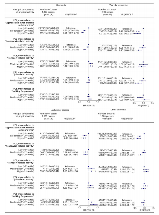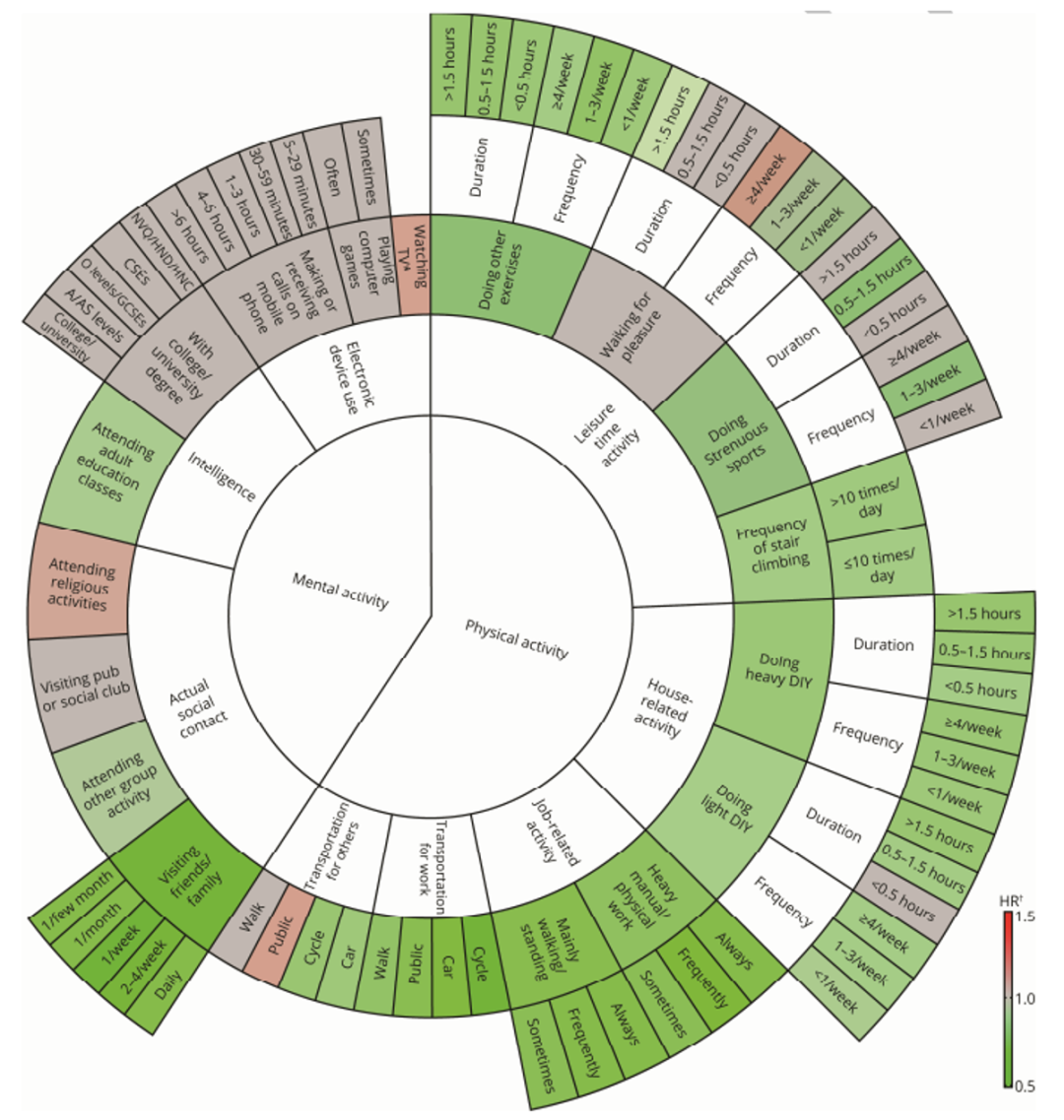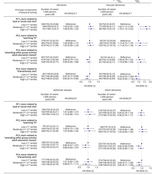之后,该团队研究了身心活动相关的项目与痴呆症之间的联系。结果发现,在体育活动方面,参与研究的体育活动项目越多,痴呆风险越低,与工作相关的活动和交通相关的项目关联最强。在精神活动方面,去酒吧或社交俱乐部和看电视等活动患痴呆风险较高。朋友/家人的拜访和其他类型活动患痴呆的风险较低。