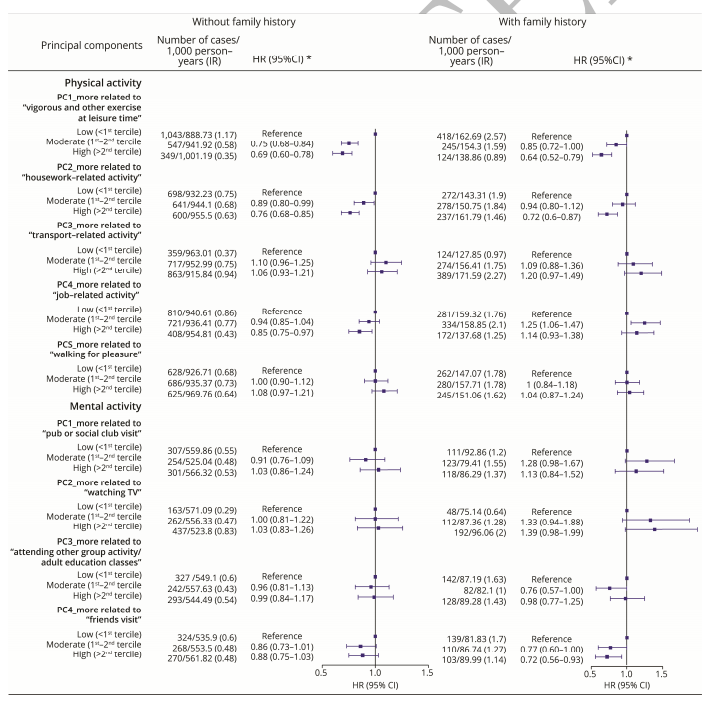 作者发现,通过PRS或APOE基因型检测,这些关联在高和低遗传风险的个体中很大程度上具有可比性。例如,在低和高遗传风险的个体中,坚持活跃运动模式的HR分别为0.64(95%CI 0.52-0.77)和0.68(95%CI 0.57-0.79)。APOEε4携带者和非携带者对应的HRs分别为0.63(95%CI 0.54-0.72)和0.68(95%CI 0.59-0.78)。在有和没有痴呆家族史的参与者中也发现了类似的结果(例如,剧烈和其他运动模式,有痴呆家族史的个体HR=0.64[95%CI 0.52-0.79],没有痴呆家族史的个体HR=0.69[95%CI 0.60-0.78])。