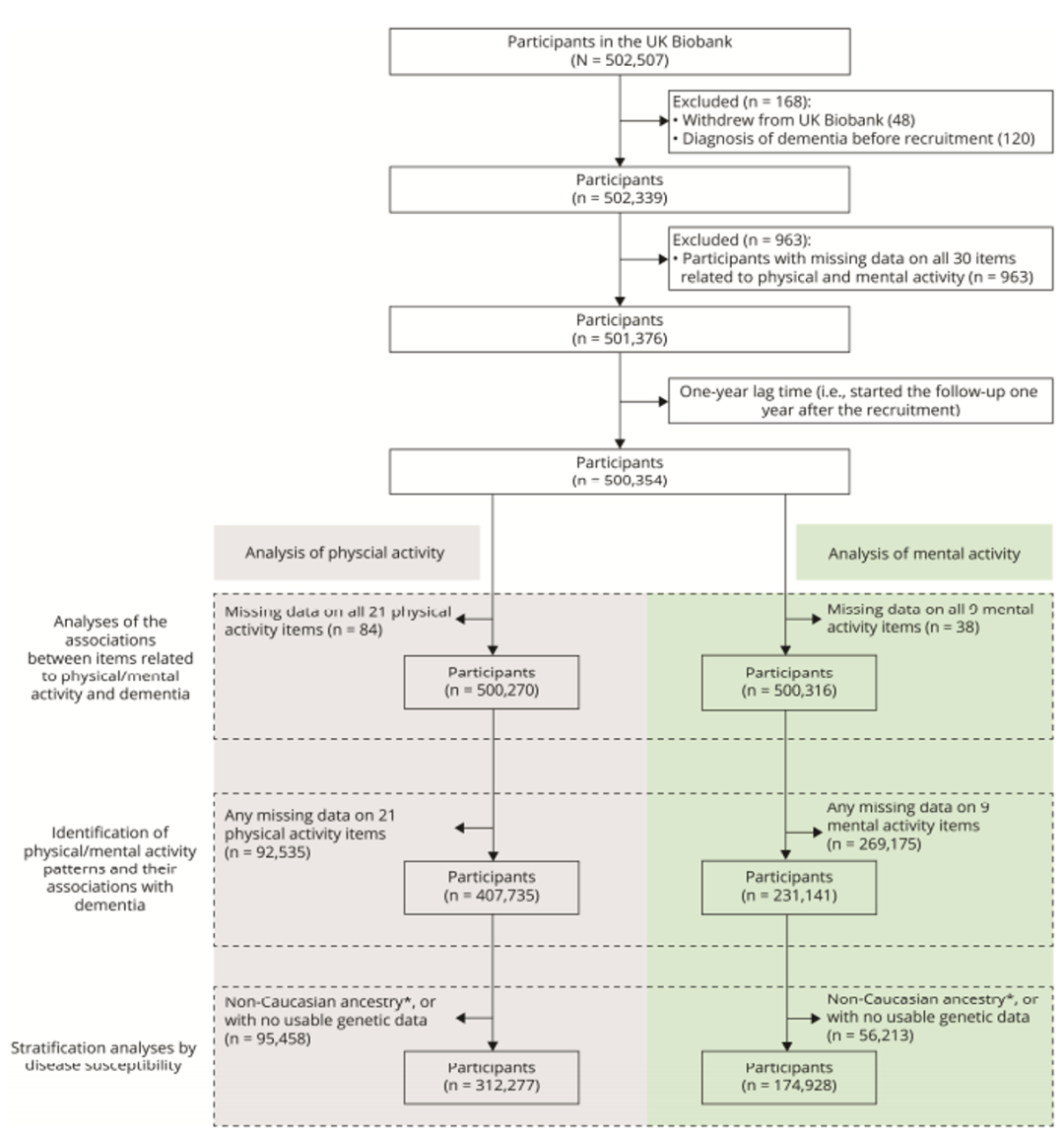 在英国生物样本库的所有502,507名个体中,作者排除了撤回数据的参与者(=48)、在招募前被诊断为痴呆(=120)或没有关于身体和心理活动的可用信息(=963)(图1)。作者构建了单独的队列来分析在基线水平测量的30个不同的身体和心理活动项目,其中一个特定项目缺失值的参与者被从该特定项目的分析中删除。剩下的参与者随后根据他们相应的暴露水平被分为不同的组(即参照组和暴露组)。考虑到痴呆的潜在诊断延迟,从而导致反向因果关系的风险(即自我报告的身体和心理活动受到痴呆临床前症状的影响),作者对每个参与者从招募日期后一年(即1年延迟),直到诊断为痴呆、死亡或研究结束(即2019年12月31日),以先发生者为准。最终的分析队列包括501,376名参与者。