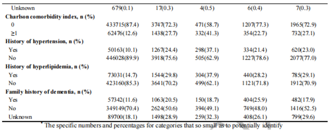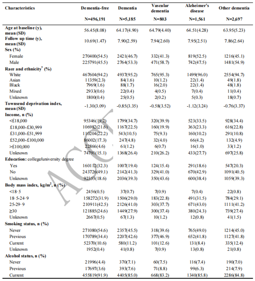 在招募者中,45.60%为男性。在平均10.66年的随访中,作者发现了5185例痴呆,包括803例血管性痴呆,1561例阿尔茨海默病和2697例其他类型痴呆。作者发现这些痴呆患者多为年龄较大、男性、有高血压或高脂血症病史,社会经济地位较低,但基线时BMI和CCI较高。但在不同亚型痴呆的个体之间,这些特征几乎没有差异。