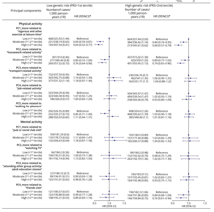 总之,本研究表明,身体和精神活动都可能影响老年人患痴呆症的风险。特别是,作者使用PCA来识别不同模式的身体和心理活动基于相关的个人活动项目,并发现坚持活跃的运动模式,做家务以及拜访朋友/家人等人群的痴呆症风险降低。此外,作者基于PRS对痴呆、APOE基因型和痴呆家族史的分层分析的研究结果一致表明,这些身体和心理活动模式的保护作用对所有研究参与者都存在,而不考虑不同的疾病易感性。这一新发现强调了身体和心理活动干预在一般人群痴呆症一级预防中的潜力。