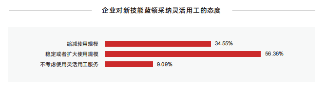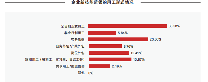伴随中西部欠发达地区发展、企业季节性用工趋势明显,新技能蓝领招工难普遍存在。根据调研结果可知,94.55% 的企业存在季节性招工难或全年招工难,主动离职率常年保持在较低水平的企业仅有三成不到。为确保新技能蓝领人才供应,67.4% 的汽车企业采用岗位外包、劳务派遣、短期用工以及校企合作等多种方式确保新技能蓝领人才供应,但仍有近半数的企业对灵活用工等方式表达隐忧。
