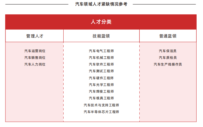 在全球的新能源和智能发展大趋势下,电动化、智能化已经成为汽车产业发展的必然选择。当下,除了传统车企在转型,科技、房产、家电等行业的知名企业也都 “虎视眈眈”,想在汽车智能化的新时代分一杯羹。不论是转型还是跨界,这些企业在新型汽车产业链上的人才储备不足,导致全行业人才供不应求现象明显,特别是复合型人才缺口问题更加严重。