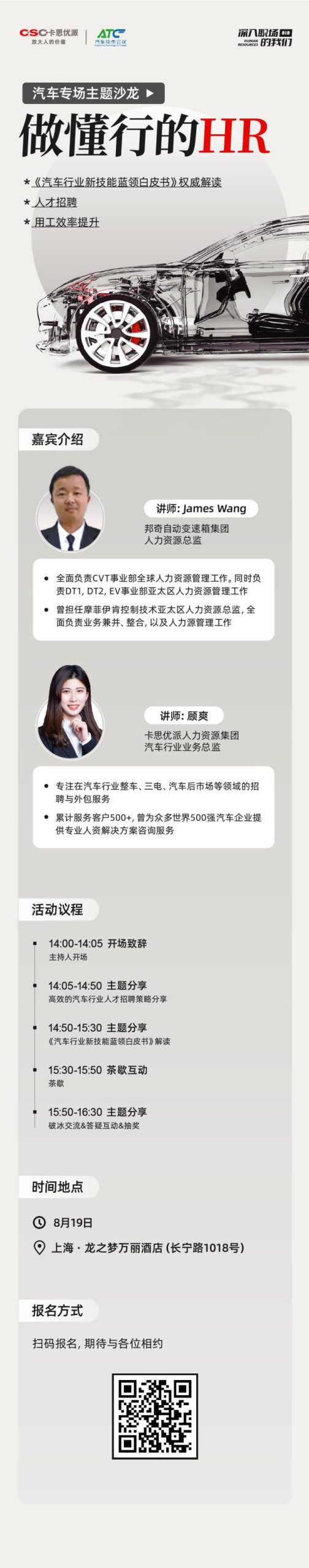 想要抢先研读白皮书内容,与汽车行业同行探讨优质话题,建立人脉圈的 HR 小伙伴,可扫描下方二维码进行报名,卡思优派期待与您 8 月 19 日相约上海。