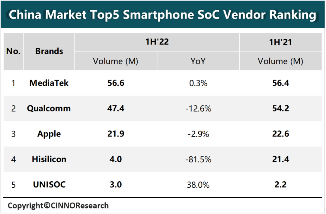 从Q2数据来看,终端消费市场陷入低迷,智能机销量走低,中国智能机SoC终端出货量约为5990万颗,环比下降约19.4%,同比下降约19.9%,其中,叠加供应链因素,华为海思环比降幅达40.5%,同比降幅达80.4%。