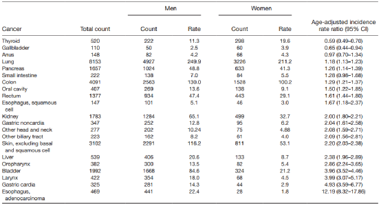 表1 按男女发病率比(IRR)最低到最高的顺序列出了21个癌症部位的癌症计数、年龄调整率和IRR