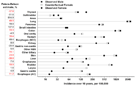 图1 男性和女性每100,000人的10年癌症发病率,Peters-Belson估计值以百分比表示