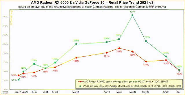 在以太坊挖矿的繁荣时期,矿工们将GPU价格推高至建议零售价的两倍以上。除了强劲的单位销售额,英伟达还能够通过制定高价提高利润率。但现在挖矿需求已经放缓,一些英伟达GPU的价格远低于建议零售价。英伟达GPU降价才刚刚开始,更糟糕的情况还在后面。