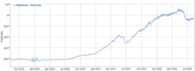 尽管需求急剧下降,英伟达的合作伙伴仍有大量库存需要转移,矿工们也可能会把用过的GPU销售到市场上。以太坊哈希率历史显示,在过去两年中,矿工们已购买了大量GPU用于挖矿。所有这些过剩的需求都可能消失。英伟达GPU的销量可能会减少数百万件。该公司三季度和四季度的情况也可能会很差。投资者最终将了解到英伟达的游戏和专业可视化业务的销售实际上有多少是由挖矿驱动的。