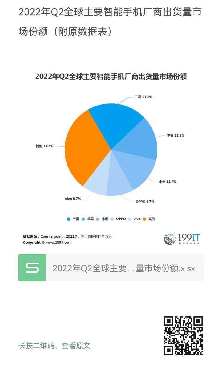 2022年Q2全球主要智能手机厂商出货量市场份额(附原数据表) ​​​​