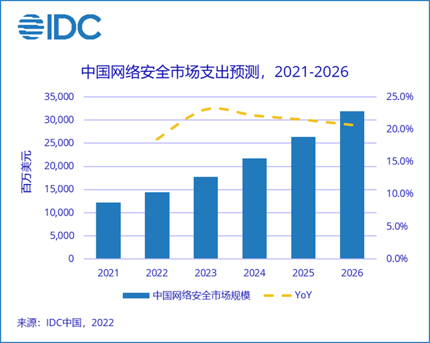 IDC于近日发布了2022年V2版IDC《全球网络安全支出指南》(IDC Worldwide Security Spending Guide)。该指南从技术、垂直行业、终端用户企业规模等多个维度回顾了2021年中国网络安全(Cybersecurity)市场,同时预测了市场未来五年(2022-2026)的发展情况。IDC数据显示,2021年全球网络安全IT总投资规模为1687.7亿美元,并有望在2026年增至2875.7亿美元,五年复合增长率(CAGR)为11.3%。聚焦中国市场,2026年中国网络安全IT支出规模将达到318.6亿美元,全球占比约为11.1%,五年CAGR约为21.2%。中国网络安全市场增速持续领跑全球,五年CAGR近全球两倍,市场前景广阔。