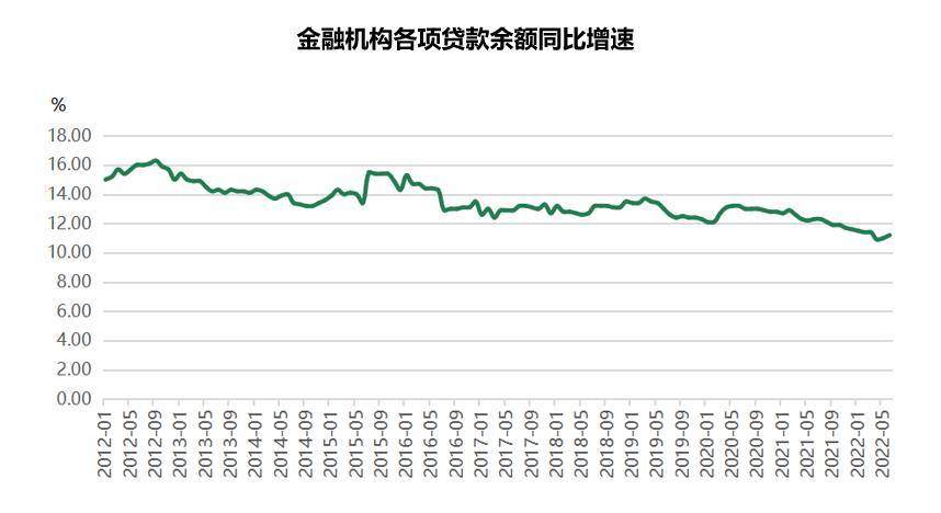 2022年6月末,金融机构各项贷款余额同比增速11.2%,较5月末提升0.2个百分点,但依旧为近20年的同比增速的低洼地。