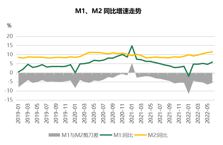 央行数据显示,2022年6月,M1 和M2 分别同比增加5.8%和11.4%,其中,M1同比增速较一季度提升约1个百分点,M2同比增速较一季度提高1.7个百分点。