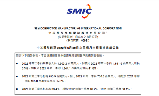 近日消息,中芯国际在港交所发布公告称,该公司2022年第二季度度的销售收入为19.03亿美元,相较于2022年第一季度度的18.4亿美元增长3.3%,相较于2021年第二季度度的13.44亿美元增长41.6%。