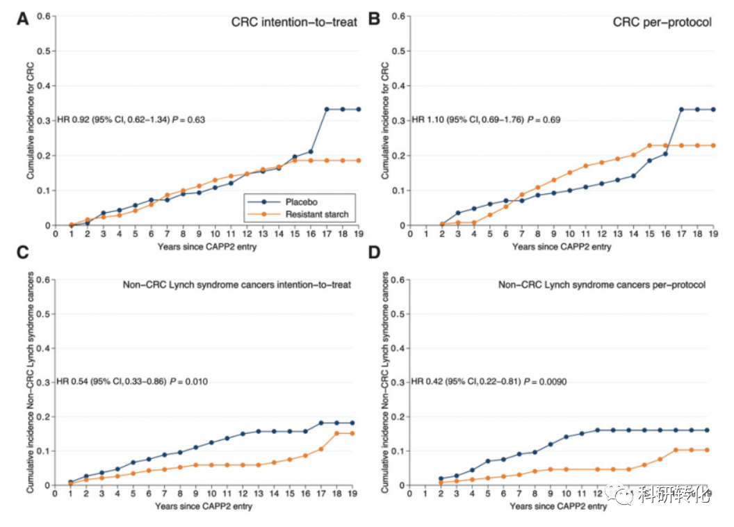 RS组的27名参与者(共29名癌症)中存在结肠外LS癌症,而安慰剂组有48名参与者(共53名癌症)。这种保护作用在ITT分析中很明显(HR,0.54;95%CI,0.33–0.86;P=0.010;),在PP分析中效果更明显(HR,0.42;95%CI,0.22-0.81;P=0.0090)。当使用IRR分析解释多个原发癌症时,RS对非结直肠癌LS癌对两种ITT的保护作用都很明显(IRR,0.52;95%CI,0.32–0.84;P=0.0075)。