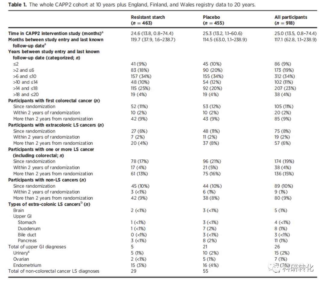 作者对整个CAPP2队列的10年加上英格兰、芬兰和威尔士的20年的分析进行了主要分析。结果发现参与者随机分配到RS(n=463)和安慰剂(n=455)每组在大约25个月的干预和约10年的随访情况相似。