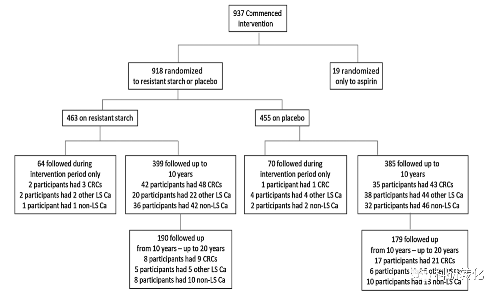 作者将937个林奇综合征患者随机分配,让其服用RS和/或阿司匹林。一共被分成了概率相同的四组:阿司匹林+RS,阿司匹林安慰剂片+RS,阿司匹林+安慰剂(玉米淀粉),或阿司匹林安慰剂片+安慰剂(玉米淀粉)。干预时长为1999年至2007年间。其中463 名林奇综合征患者在两年多的时间内每天摄入 30 克抗性淀粉粉。这个每日的量大致相当于吃两个略带绿色的香蕉所得到的量。另有 455 人接受了由玉米淀粉制成的安慰剂。