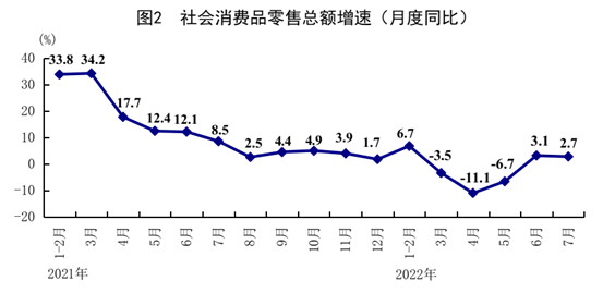 7月份,社会消费品零售总额35870亿元,同比增长2.7%,比上月回落0.4个百分点;环比增长0.27%。按经营单位所在地分,城镇消费品零售额31205亿元,同比增长2.7%;乡村消费品零售额4665亿元,增长2.6%。按消费类型分,商品零售32176亿元,同比增长3.2%;餐饮收入3694亿元,下降1.5%。基本生活消费稳定增长,限额以上单位粮油食品类、饮料类商品零售额分别增长6.2%、3.0%。升级类商品销售较快增长,限额以上单位金银珠宝类、文化办公用品类、家用电器和音像器材类商品零售额分别增长22.1%、11.5%、7.1%。1-7月份,社会消费品零售总额246302亿元,同比下降0.2%,降幅比1-6月份收窄0.5个百分点。全国网上零售额73224亿元,增长3.2%。其中,实物商品网上零售额63153亿元,增长5.7%;占社会消费品零售总额的比重为25.6%。