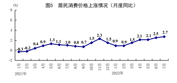 7月份,全国居民消费价格(CPI)同比上涨2.7%,涨幅比上月扩大0.2个百分点;环比上涨0.5%。分类别看,食品烟酒价格同比上涨4.7%,衣着价格上涨0.7%,居住价格上涨0.7%,生活用品及服务价格上涨1.4%,交通通信价格上涨6.1%,教育文化娱乐价格上涨1.5%,医疗保健价格上涨0.7%,其他用品及服务价格上涨0.9%。在食品烟酒价格中,粮食价格上涨3.4%,鲜菜价格上涨12.9%,鲜果价格上涨16.9%,猪肉价格上涨20.2%。扣除食品和能源价格后的核心CPI同比上涨0.8%,涨幅比上月回落0.2个百分点。1-7月份,全国居民消费价格同比上涨1.8%。