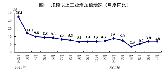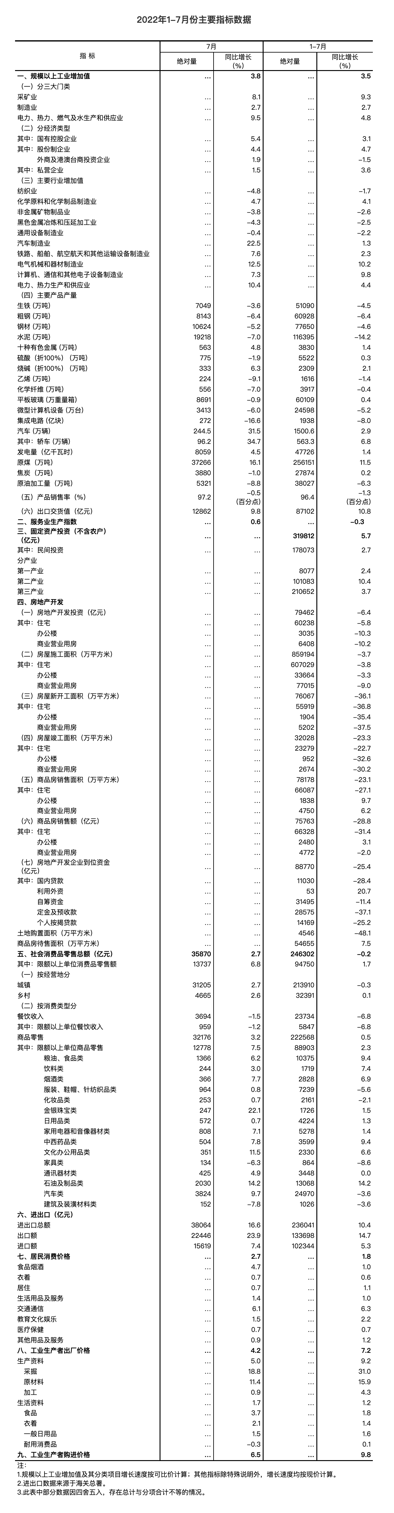 7月份,全国规模以上工业增加值同比增长3.8%,比上月回落0.1个百分点;环比增长0.38%。分三大门类看,采矿业增加值同比增长8.1%,制造业增长2.7%,电力、热力、燃气及水生产和供应业增长9.5%。装备制造业、高技术制造业增加值同比分别增长8.4%、5.9%,分别比规模以上工业增加值快4.6、2.1个百分点。分经济类型看,国有控股企业增加值同比增长5.4%;股份制企业增长4.4%,外商及港澳台商投资企业增长1.9%;私营企业增长1.5%。分产品看,新能源汽车、太阳能电池等绿色智能产品产量同比分别增长112.7%、33.9%。1-7月份,全国规模以上工业增加值同比增长3.5%,比1-6月份加快0.1个百分点。7月份,制造业采购经理指数为49.0%,企业生产经营活动预期指数为52.0%。1-6月份,全国规模以上工业企业实现利润总额42702亿元,同比增长1.0%。