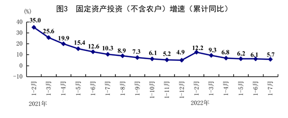1-7月份,全国固定资产投资(不含农户)319812亿元,同比增长5.7%,比1-6月份回落0.4个百分点;7月份环比增长0.16%。分领域看,基础设施投资同比增长7.4%,制造业投资增长9.9%,房地产开发投资下降6.4%。全国商品房销售面积78178万平方米,同比下降23.1%;商品房销售额75763亿元,下降28.8%。分产业看,第一产业投资同比增长2.4%,第二产业投资增长10.4%,第三产业投资增长3.7%。民间投资增长2.7%。高技术产业投资增长20.2%,其中高技术制造业和高技术服务业投资分别增长22.9%、14.3%。高技术制造业中,电子及通信设备制造业、医疗仪器设备及仪器仪表制造业投资分别增长27.5%、26.6%;高技术服务业中,科技成果转化服务业、研发设计服务业投资分别增长16.2%、15.5%。社会领域投资增长14.5%,其中卫生、教育投资分别增长33.0%、8.2%。