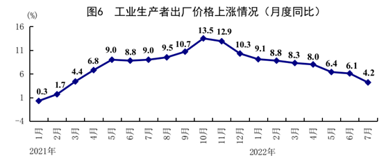 7月份,全国工业生产者出厂价格同比上涨4.2%,涨幅比上月回落1.9个百分点;环比下降1.3%。工业生产者购进价格同比上涨6.5%,环比下降0.9%。1-7月份,全国工业生产者出厂价格、工业生产者购进价格同比分别上涨7.2%、9.8%。