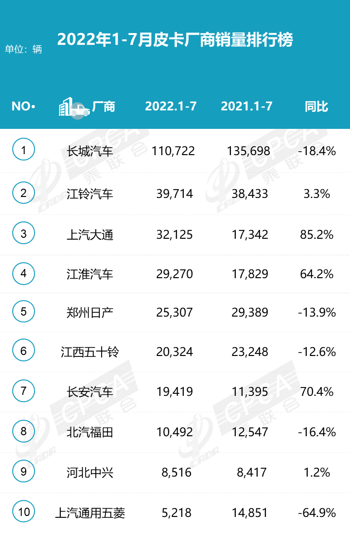 根据乘联会最新数据,2022年7月份皮卡市场销售4.4万辆,同比增长11.9%,环比下降15.1%。由于疫情下皮卡生产受阻形势得到改善,出口增长势头迅猛,因此7月皮卡的产销表现回暖,这也是上海疫情改善后带来的行业共同特征。7月皮卡厂商销量排名相对稳定,长城汽车保持强势领军,江淮皮卡走势较强。今年以来皮卡走势相对异常波动,主要是供给端的影响。1-7月皮卡达到30.3万辆,较2021年1-7月下降3.5%,产销表现偏弱。