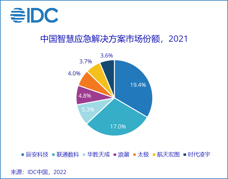 备注:本报告中,IDC 在智慧应急平台解决方案市场中进一步分析了智慧应急大数据与人工智能子市场,市场份额前四家技术提供商分别为:商汤科技(13.0%)、百分点(6.7%)、数梦工场(6.3%)、四方伟业(3.7%)。
